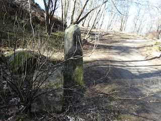 På stigen som går upp till husen i Kärrdalen, i den sista backen står en ensam grindstolpe.