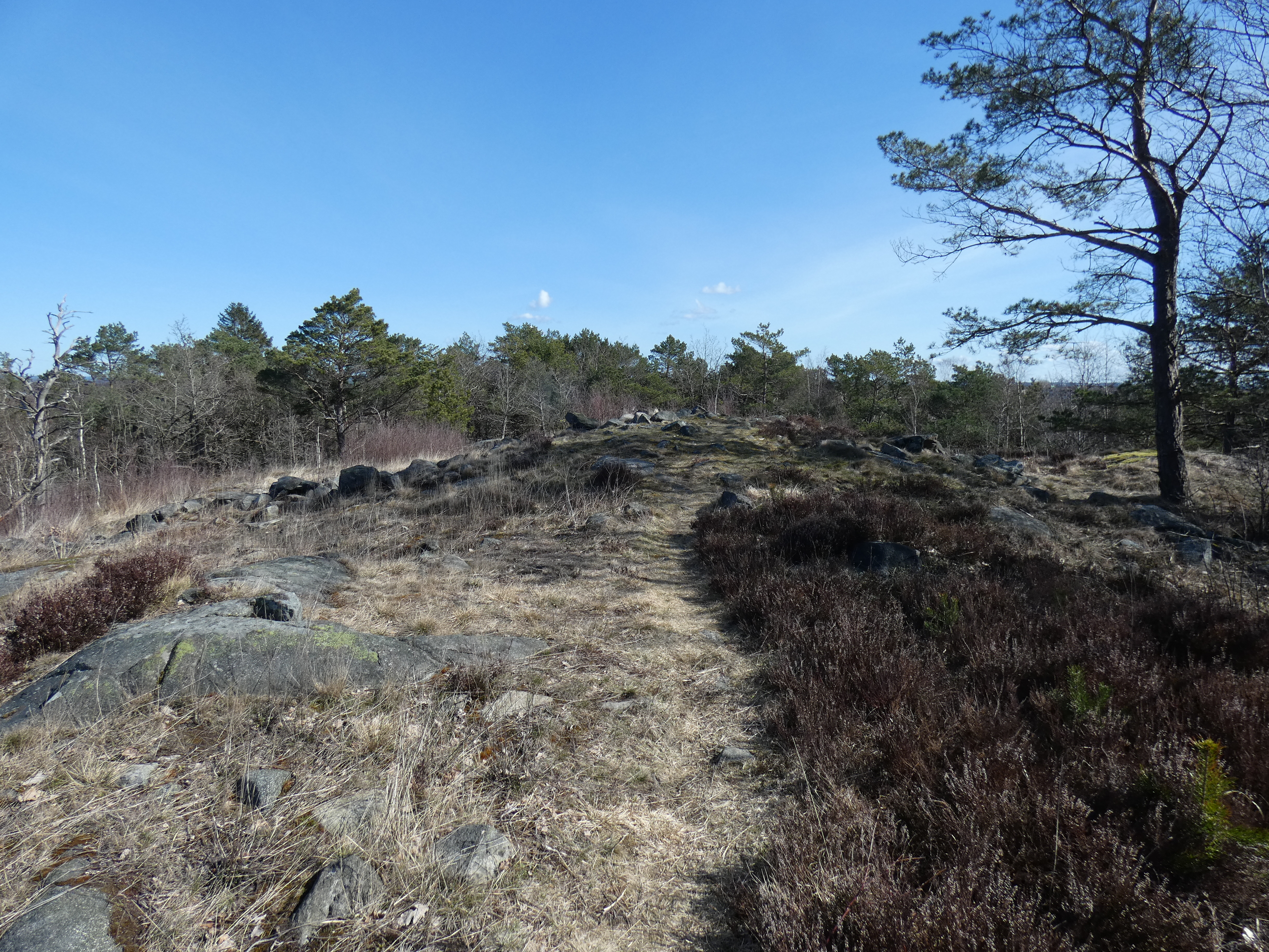 Jag går upp i skogsområdet, Sjumilaskogen, som ligger mellan stadsdelen och Hisingsleden. Jag letar efter Store Vette. Ett bronsåldersröse som också varit gränsmarkering mellan, som ni som läst tidigare inlägg vet, Lundby och Björlanda, Västergötland och Bohuslän och Sverige och Norge. Jag följer först en stig och sedan en annan. Kollar Google maps och inser att jag är för långt åt söder. Vänder norrut, det ligger slängda munskydd efter stigen, och snart står jag på toppen av höjden.