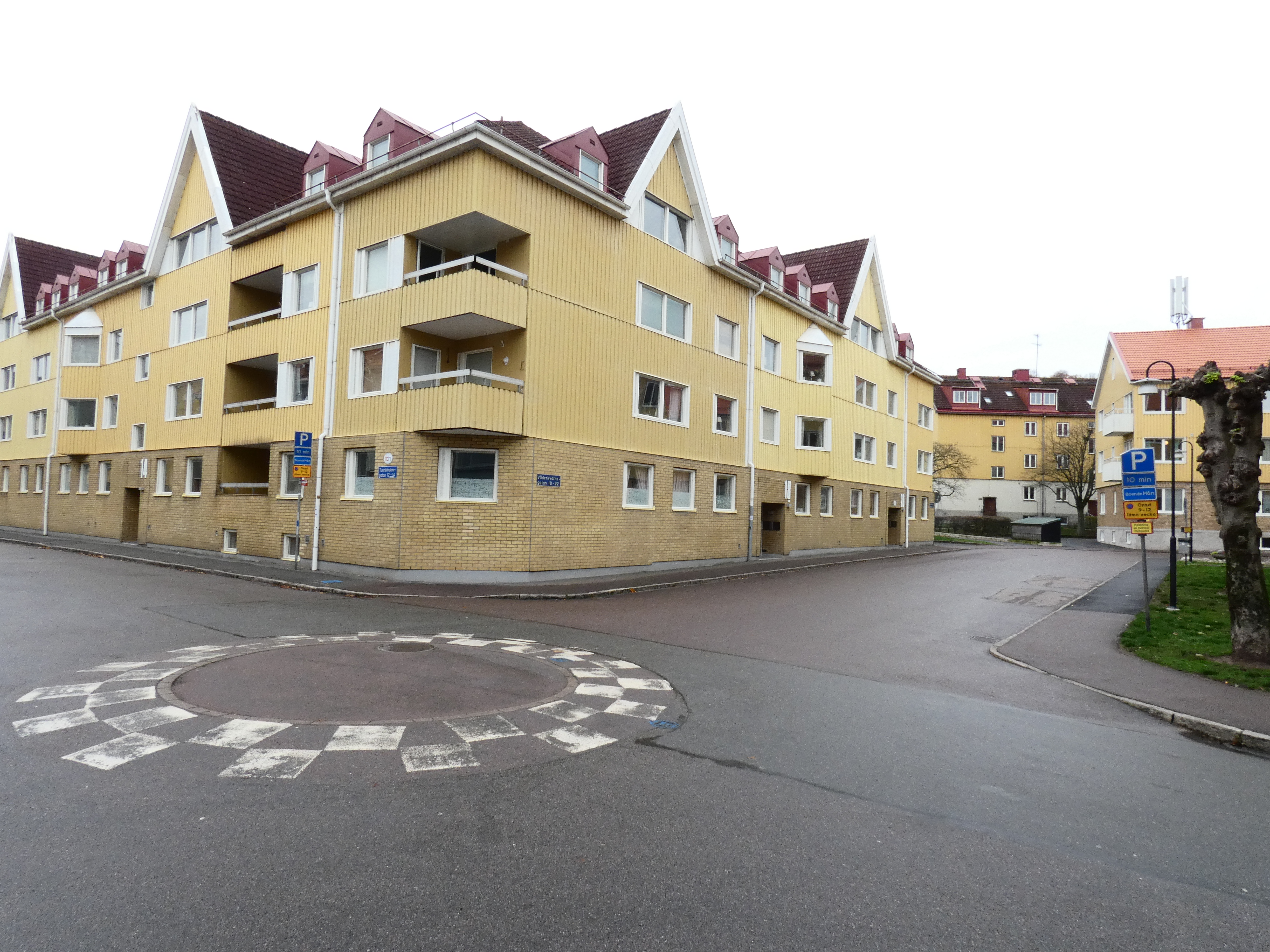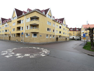 Vid korsningen till Jägaregatan svänger jag höger. Här ligger två huslängor, Solgårdarna.