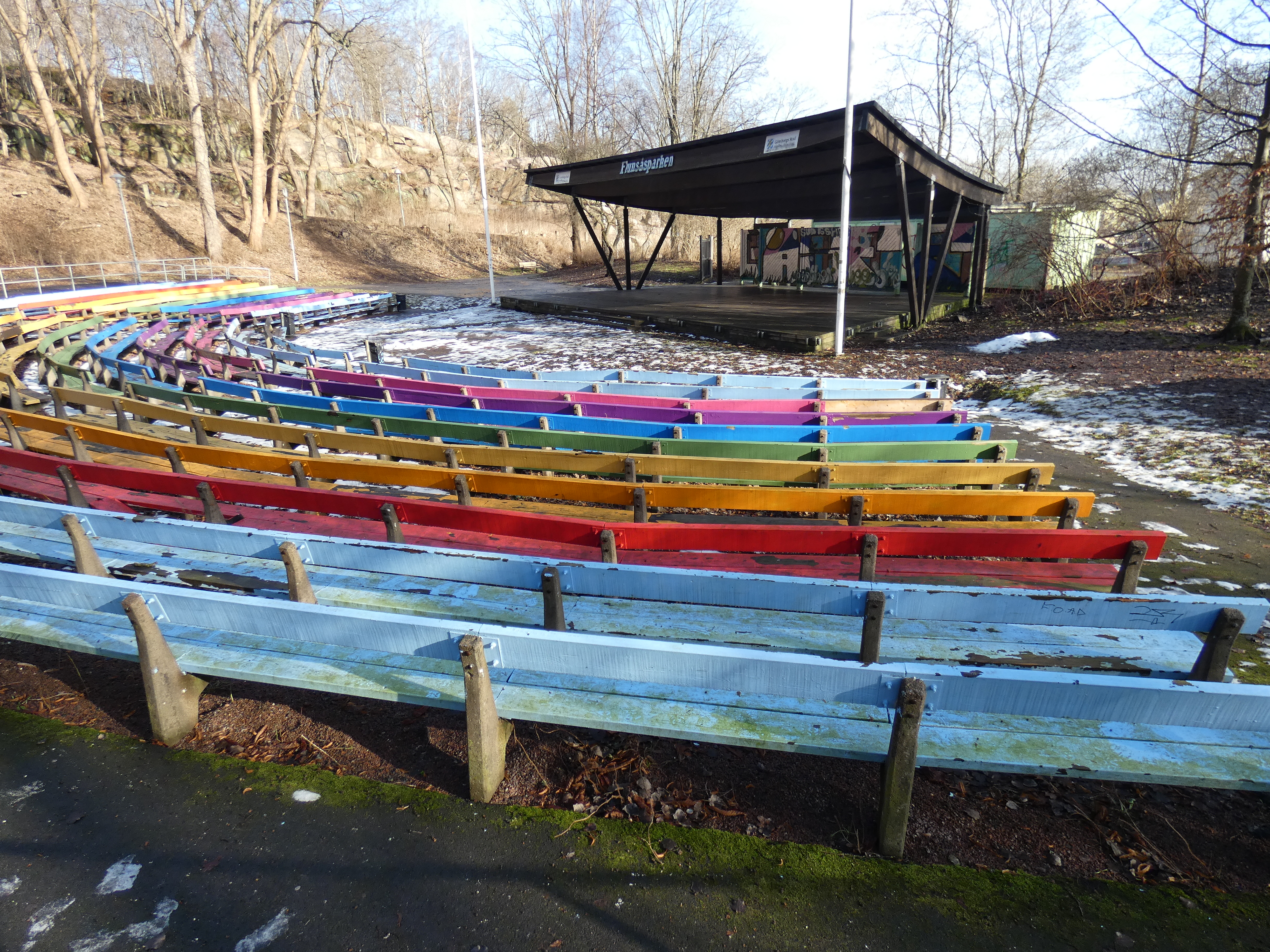 Jag vänder tillbaka till Sockenvägen, som är en del av den gamla Prästvägen jag skrev om tidigare, och går upp till Flunsåsparken. Entrén är lite sliten och klottrad på. Bänkarna är målade i glada färger men om det blir någonting i år, 2021, är väl osäkert p.g.a. covid.