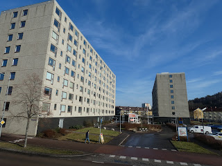 Förr , när jag bodde här, ett blått landshövdingehus med två flyglar i vinkel. Huset byggdes från början åt Götaverkens förmän 1919. När vi bodde där var det Bostadsbolaget som förvaltade det. Vi bodde i en lätt renoverad tvåa, med dusch i en garderob. Utsikten mot berget var fin. Första sommaren förstod vi inte varför det var så fuktigt och rått i lägenheten.