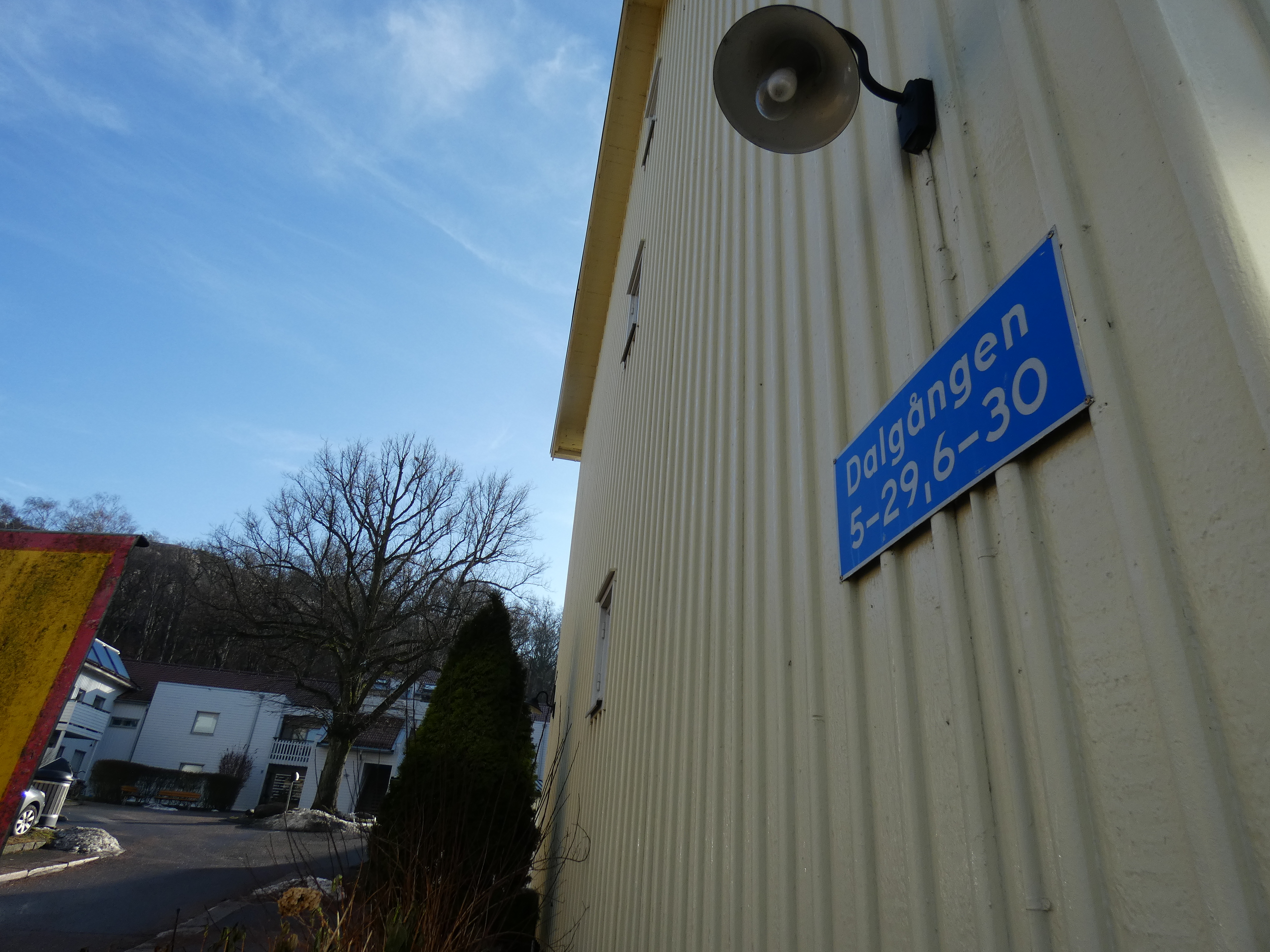 De låga husen på högersidan byggdes på fyrtiotalet i samma stil som borta vid Lammelyckan. Här bodde jag i ett par år. I en trea, omgjord från två ettor. Bakom ligger Dalgången. Nu vita bostadsrätter byggda 1993 enligt passivhuskonceptet. Det stora trädet på gården finns kvar och det finns odlingar och grillplatser.